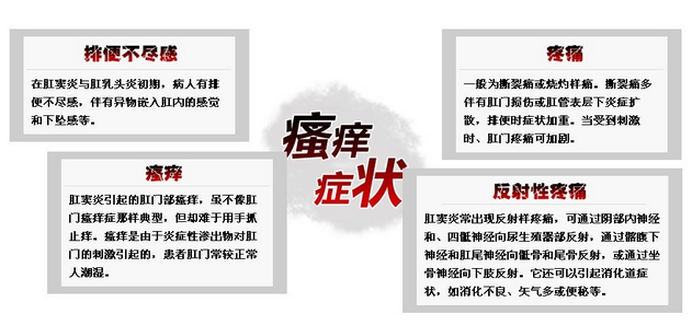 1、瘙痒:瘙痒是很常见的症状,主要是肛门周边瘙痒难忍,如虫行蚁走,令人坐卧不安,一般是由于炎症性渗出物对肛门的刺激引起的。