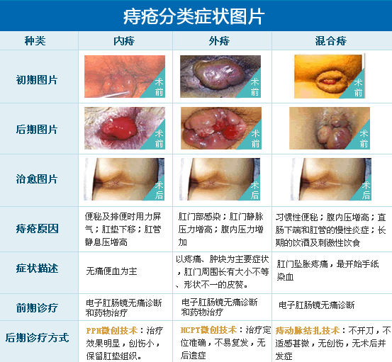 上述3大症状是对痔疮症状的大致概括,实际上痔疮细分为三种,内痔、外痔、混合痔,三种痔疮各有不同的症状表现:
