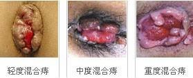 混合痔的症状:肛门坠胀疼痛,最开始手纸染血,后期出现滴血或射血,晚期出现痔核脱垂,轻者可自行还纳,重者需用手送回。